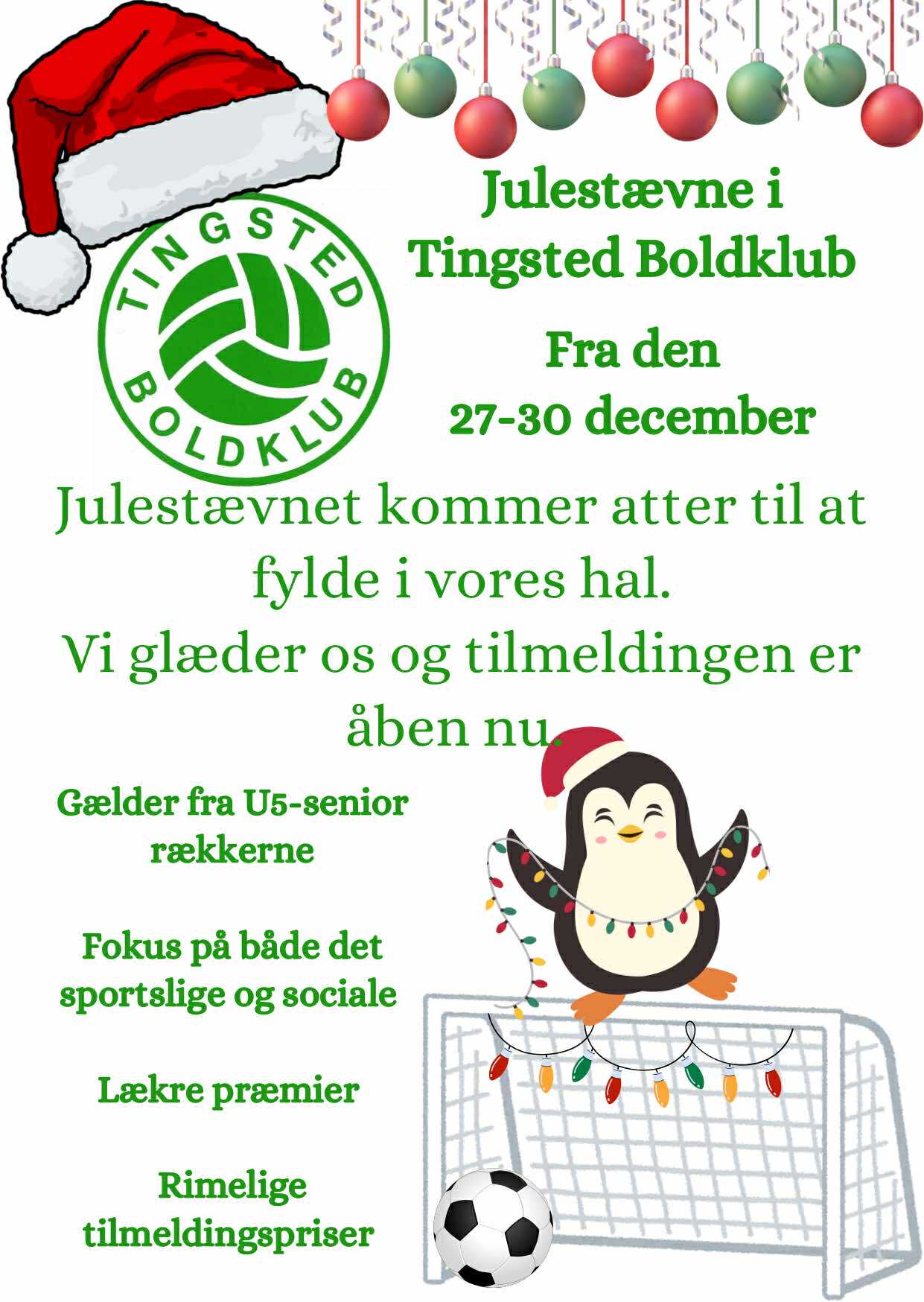 Vi glæder os til at se jer til fire dage med fodbold, hygge og julestemning! Med sportslig hilsen Tingsted Boldklub